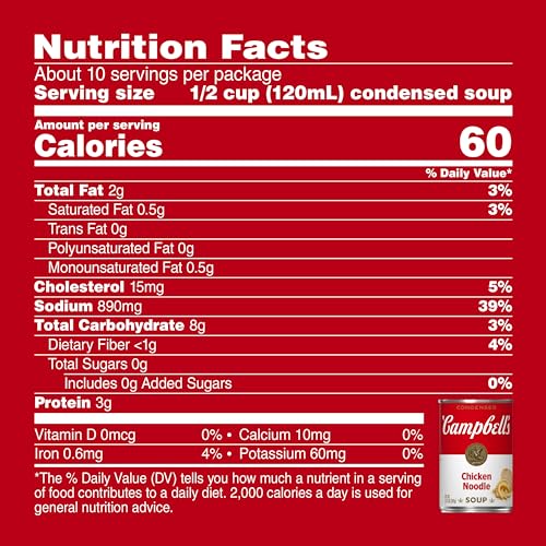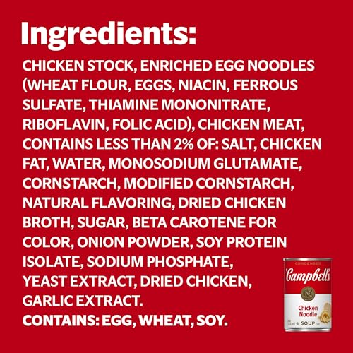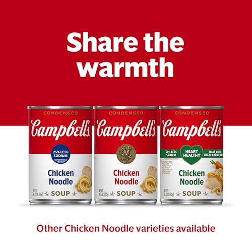 Details: Cozy up with a steamy bowl of Campbell’s Condensed Chicken Noodle Soup. A family favorite for generations, this delicious chicken soup is crafted with perfectly seasoned golden chicken broth, egg noodles, and tender chicken meat with no antibiotics. The result is a canned chicken noodle soup that brings a smile with every spoonful. Top it with Pepperidge Farm Golden Butter Crackers, season it with fresh herbs, or pair it with a sandwich or salad for something quick and easy. This convenient canned soup is a year-round pantry staple and the perfect comfort food on a chilly day or when you’re feeling under the weather. Simply mix the condensed soup with 1 can of water and microwave on high for 2.5 to 3 minutes in a covered microwave-safe bowl, or heat in a pot on the stove, stirring occasionally. Each 10.75 oz recyclable can contains about 2.5 servings of microwave soup and features a non-BPA lining. From Chicken Noodle to Cream of Mushroom and everything in between, Campbell’s makes delicious soups in flavors your family knows and loves, with quality, farm-grown ingredients in every can. M’m! M’m! Good!