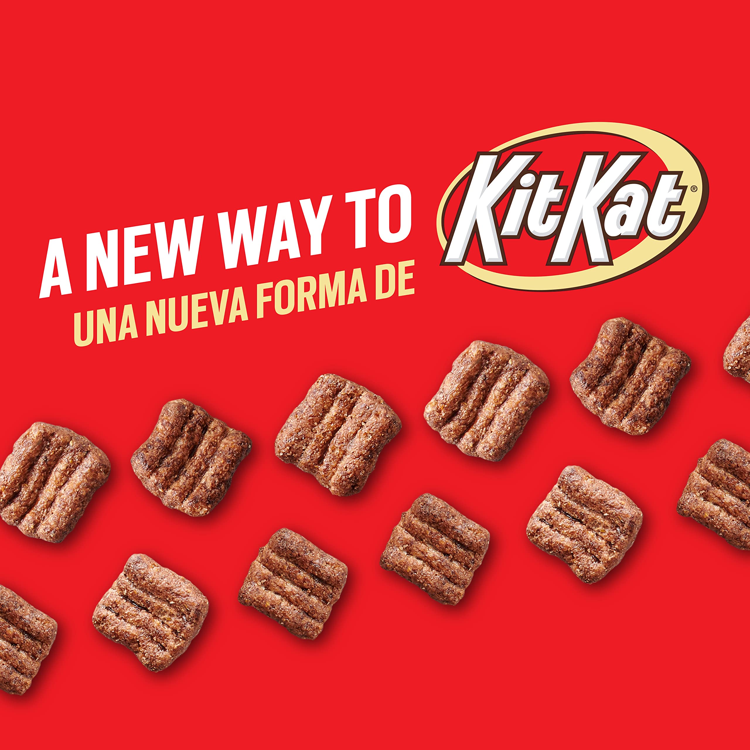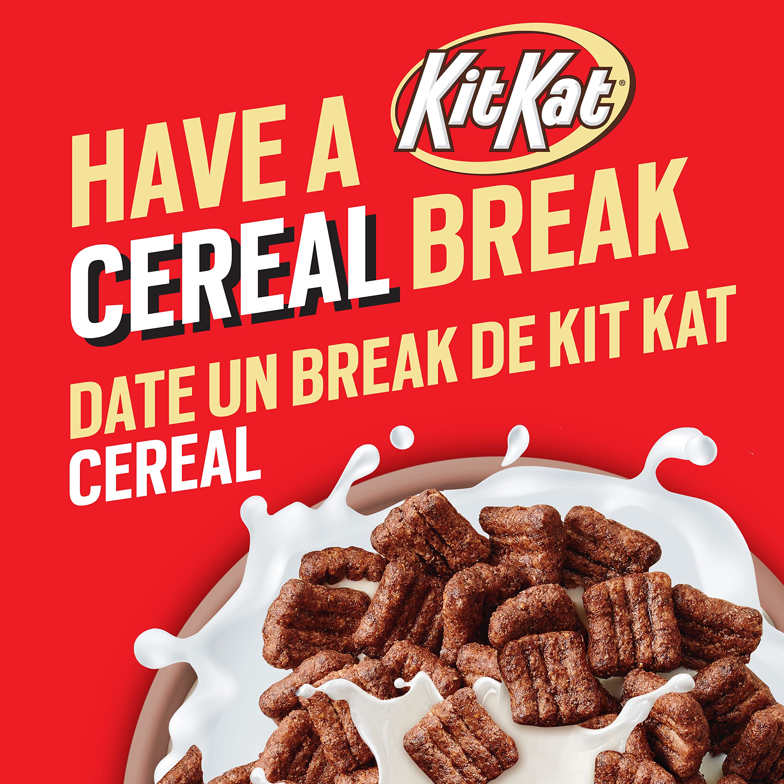 - KIT KAT CEREAL: Pieces shaped like little KIT KAT candy bars with a creamy coating and satisfying crunch make cereal breaks delicious