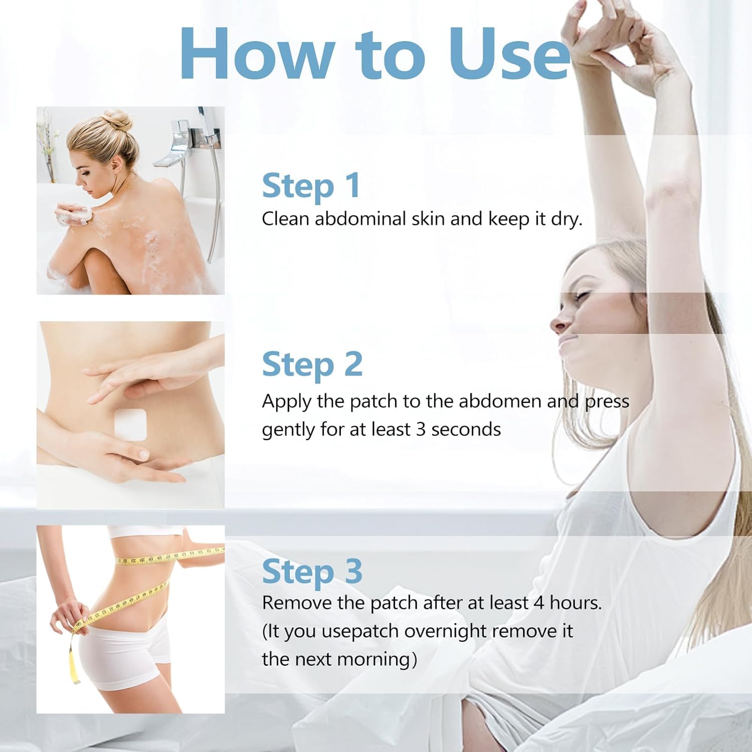- 【Method of application】Before going to bed, apply one of these patches to the skin around your navel. It will work while you are sleeping. It has excellent adhesion and will not come off. Just remove it after waking up and it won’t affect your daily life.
