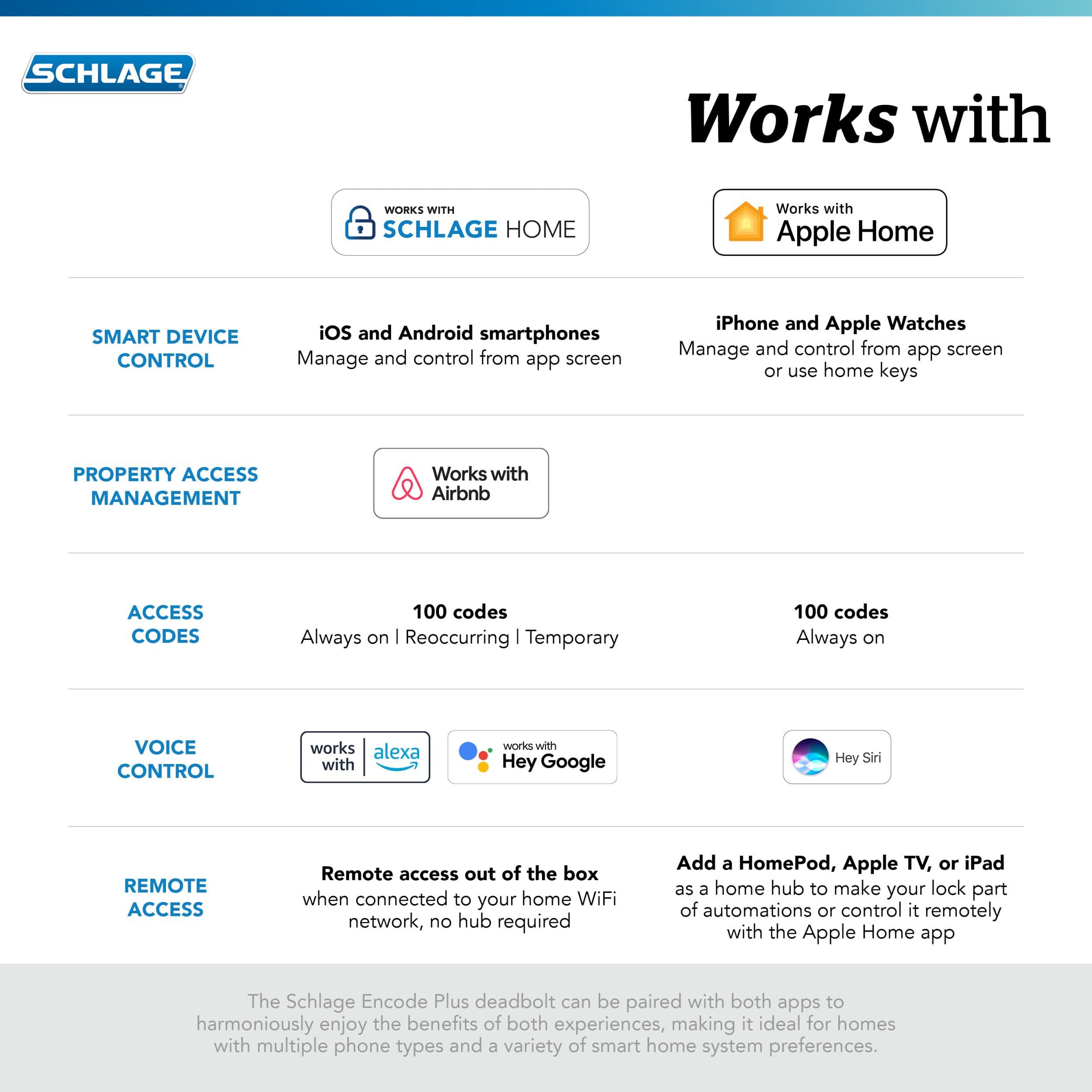 - PEACE OF MIND: Lock and unlock from anywhere, manage up to 100 access codes, view lock history, receive customizable notifications and easily manage multiple locks at once – all when paired to the Schlage Home app and connected to a secure WiFi network